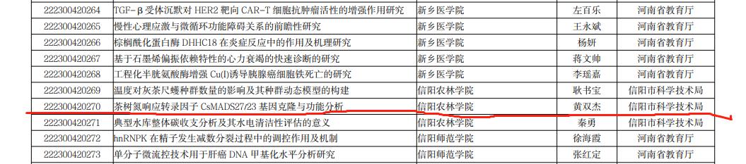 1月26日,河南省科技厅发文(豫科〔2022〕13号)下达了河南省二○二二年科技发展计划,茶学院黄双杰博士申报的“茶树氮响应转录因子 CsMADS27/23 基因克隆与功能分析”项目被批准为河南省自然科学基金青年科学基金项目(222300420270);罗金蕾博士申报的“茶树叶片果胶与氟的结合机制研究及应用”被批准为河南省科技攻关项目(222102110468)。(撰稿人:义茗 审核人:郭桂义)