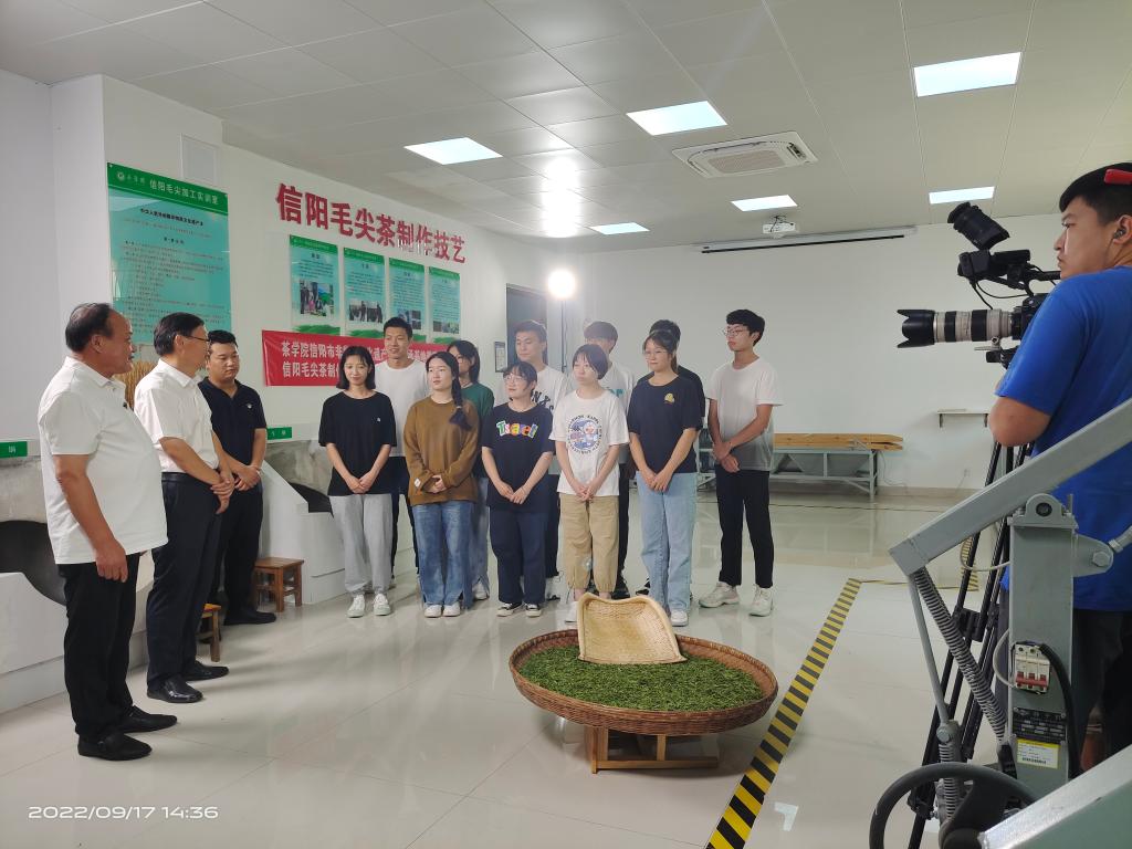 摄制组围绕信阳毛尖制作技艺专访郭桂义教授,就信阳毛尖发展历史、信阳毛尖制作技艺特点、高校开展信阳毛尖茶制作技艺传承工作现状与困境、如何积极进行信阳毛尖非遗研究及保护等相关问题进行了深度访谈。同时,摄制组专程来到茶学院市级非物质文化遗产社会传承基地(信阳毛尖茶制作技艺),拍摄由国家级非物质文化遗产代表性传承人周祖宏(绿茶制作技艺(信阳毛尖茶制作技艺)与郭桂义教授及《制茶学》专业教师孔亚帅带领学生开展的现场传承教学活动。