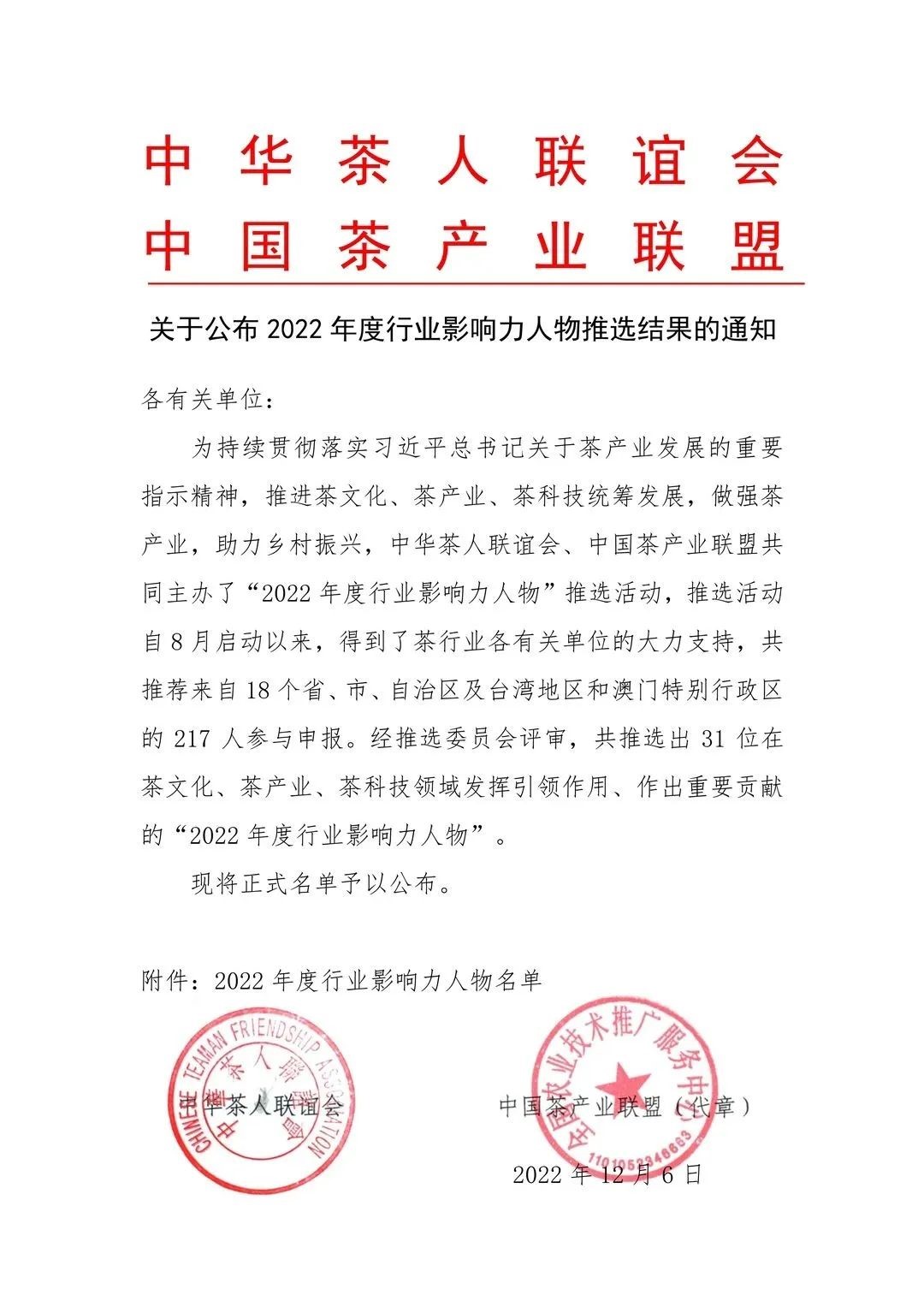 日前,中华茶人联谊会、中国茶产业联盟主办的“2022年度行业影响力人物”推选活动结果正式公布。活动共推荐来自18个省、市、自治区及台湾地区和澳门特别行政区的217人,最终仅推选出31位在茶文化、茶产业、茶科技领域发挥引领作用、作出重要贡献的“2022年度行业影响力人物”,beat365在线平台官网茶学院郭桂义教授入选,充分肯定了郭桂义教授40年来为茶文化、茶产业、茶科技的发展所做的贡献。