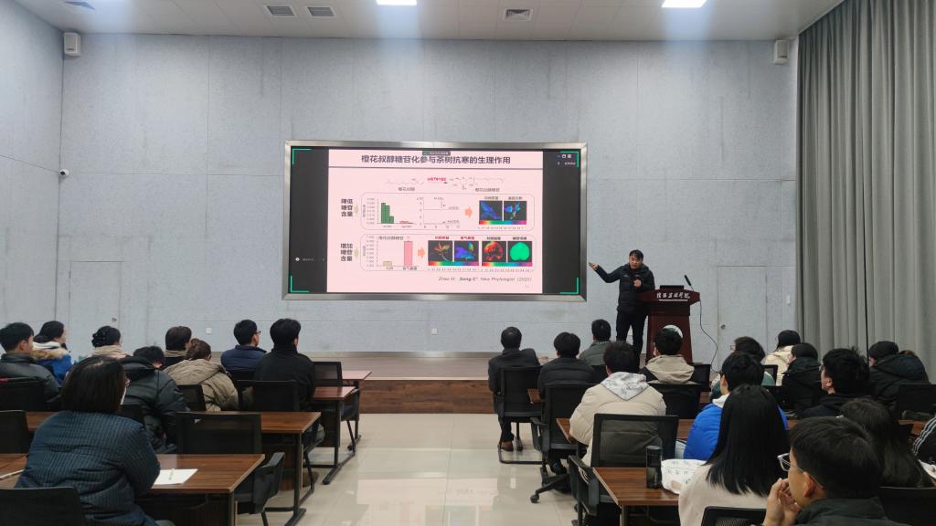宋传奎教授以“茶树香气物质糖苷化机制及其生理功能”为题,结合多年的研究工作实践和积累,从香气物质研究进展、茶树香气糖苷的合成和生理功能、茶树香气物质在参与茶树抗虫的作用机制三方面做了详细介绍;深度解析了橙花叔醇在参与茶树抗寒过程中发挥的生理功能,以及丁香酚糖苷在参与茶树抗寒和抗旱的双重功能研究,该研究为茶树香气糖苷类施缓剂在茶园管理中应用提供理论基础和数据支持。