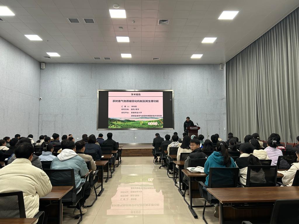 随后,宋传奎教授一行在双创中心多媒体报告厅为茶学院师生作学术报告。茶学院院长、党总支书记郭桂义教授,茶学院副院长孙慕芳教授、副院长陈义教授及部分专业教师和在校学生、茶叶行业从业者近二百人通过线上线下结合的方式参加了报告会,报告会由茶学院院长郭桂义教授主持。报告会上,郭院长简要介绍了宋传奎教授、夏恩华教授的研究方向和研究成果。