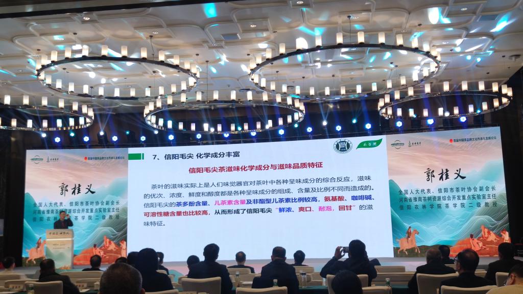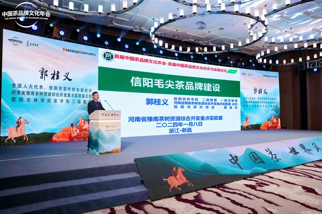 1月8日晚上举行首届中国茶品牌文化传承与发展论坛。中国农业科学院茶叶质量与风险评估创新团队资深首席科学家鲁成银、中茶所茶深加工与多元化利用团队首席科学家尹军峰、同济大学哲学系副教授何心鹏(德国)等国内外专家学者分别从茶叶产区、海外传播、生活美学等不同的角度探讨茶品牌文化传承与发展。郭桂义教授以信阳毛尖茶品牌建设为主题,从信阳毛尖品牌建设成效和建设措施两个方面分享了河南茶叶品牌发展的经验。