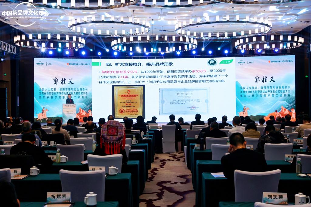 郭桂义教授首先从信阳茶产业规模、相关标准的制定、信阳毛尖公共品牌价值、获得的荣誉以及非物质文化遗产代表作名录等方面介绍了信阳毛尖品牌建设的突出成效。从提升发展质量,夯实产业基础;加快转型升级,持续提质增效;强化品牌创建,努力开拓市场;扩大宣传推介,提升品牌形象;实施品牌管理,强化品牌保护;研究信阳茶特点,助力品牌推广等方面分享了信阳毛尖品牌建设采取的措施。郭桂义教授指出信阳茶文化节为茶界搭建了一个合作交流的平台,进一步扩大了信阳毛尖公用品牌与企业品牌的影响力和知名度。信阳市组织参加国际国内茶事活动宣传推介信阳毛尖,同时在信阳市内建设各类带信阳毛尖元素的建筑和场所,作为城市名片,多渠道、多媒体宣传,打造和展示信阳毛尖品牌形象。郭桂义教授根据自身对信阳毛尖茶的调研和研究结果,详细介绍了信阳地区优异的生态环境、独特的炒制工艺以及信阳毛尖茶的品质风格和化学成分特征。