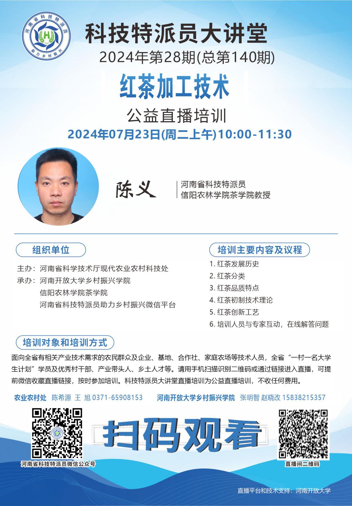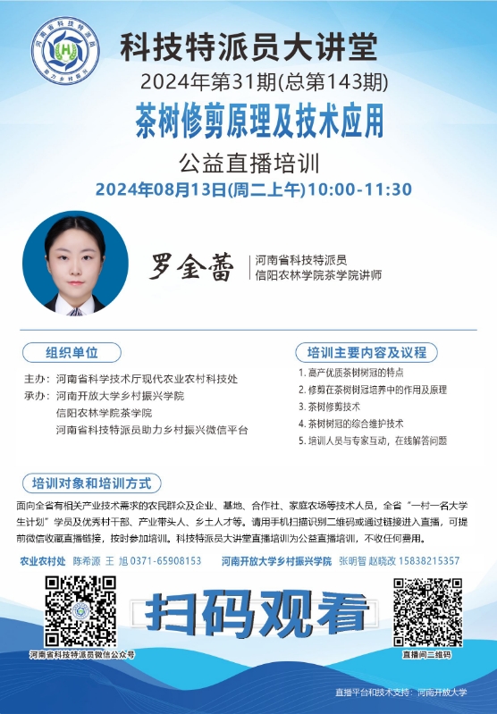 为助力茶产业提质增效,以科技赋能乡村振兴,7月23日上午和8月13日上午,我院河南省科技特派员陈义教授和罗金蕾博士分别受河南省科技厅现代农业农村科技处的邀请,赴郑州做河南省科技特派员大讲堂公益培训。培训采用线上直播形式进行,陈义教授的培训题目为“红茶加工技术”,陈义教授从红茶发展历史、红茶分类、红茶品质特点、红茶初制技术理论、红茶创新工艺五个方面进行了阐述。罗金蕾博士的培训题目为“茶树修剪原理及技术应用”,培训内容主要包括高产优质茶树树冠的特点、修剪在茶树树冠培养中的作用及原理、茶树修剪技术、茶树树冠的综合维护技术等几方面。两位特派员在培训前对课件、讲稿等进行了精心准备,培训过程中对授课内容进行了细致的讲解,培训结束后对培训人员提出的问题进行了详细解答,取得了较好成效,得到了广泛的关注 。(撰稿/罗金蕾 审核/陈义 终审/孙慕芳 摄影/河南开放大学张明智)。