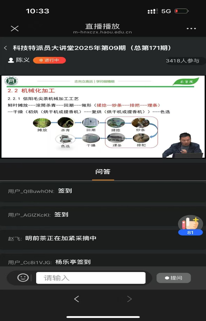 为助力茶产业提质增效,指导2025年信阳毛尖春茶生产,以科技赋能助力乡村振兴。4月1日上午,我院河南省科技特派员陈义教授受河南省科技厅现代农业农村科技处的邀请,赴郑州做河南省科技特派员大讲堂公益培训。培训采用线上直播形式进行,陈义教授的培训题目为“信阳毛尖加工技术与审评方法”,在培训中,他从信阳毛尖生产历史与荣誉、标准化发展历程、信阳毛尖加工工艺相关术语及注意事项、信阳毛尖加工工艺演变历史、信阳毛尖加工工艺流程、信阳毛尖感官审评方法等方面进行了详细讲解,并分享了不同做形对信阳毛尖耐泡性影响、不同嫩度信阳毛尖品质特点、不同鲜叶部位鲜叶生化成分特点等近年相关研究结果。陈义教授在培训前对课件和讲稿进行了精心准备,培训过程中他细致讲解,条理清晰,深入浅出,培训结束后对培训人员提出的问题进行了详细解答。本次培训在线人数高达3400余人,取得了较好成效,得到了广泛的关注 。(撰稿:罗金蕾 摄影:河南开放大学张明智)