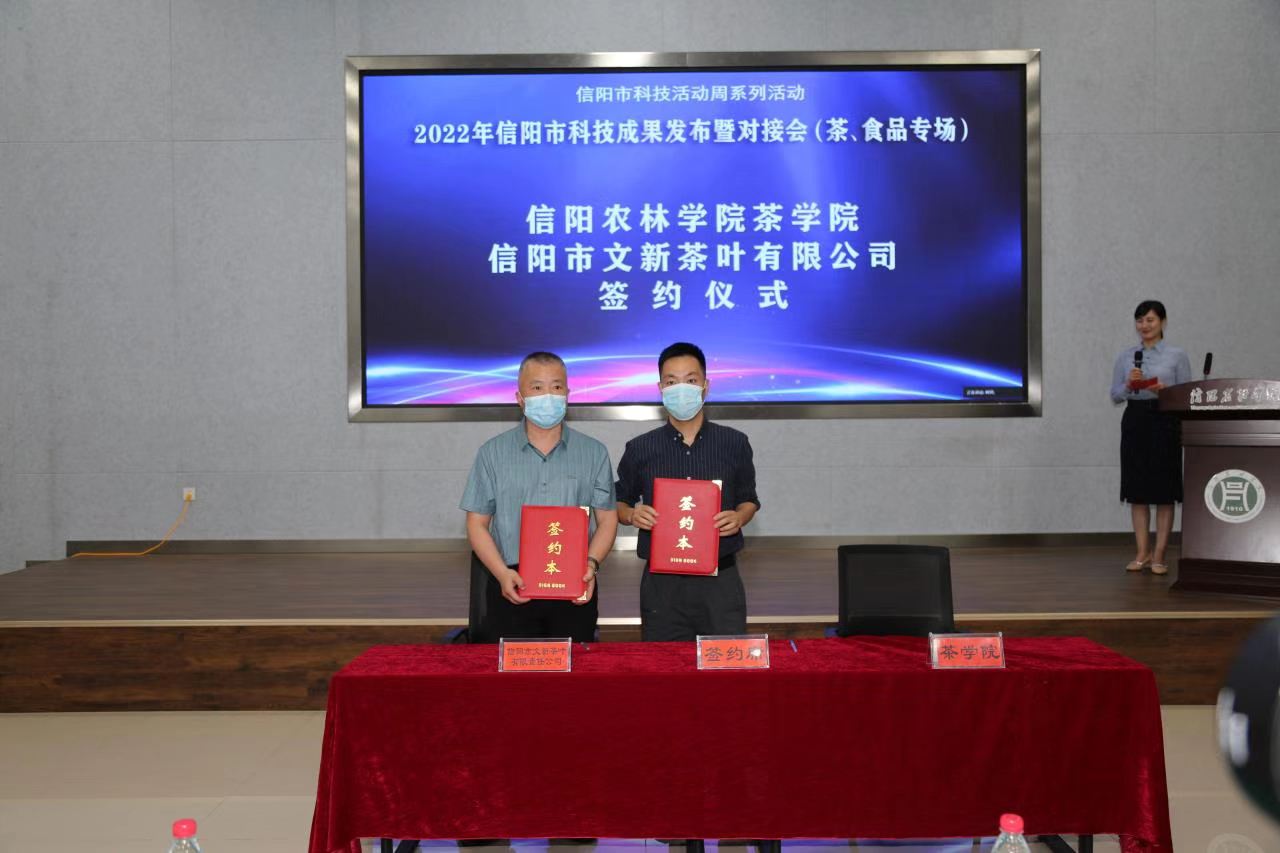对接会上,茶学院院长郭桂义教授对科研成果进行了推介,郭院长从学院概况、研究方向、主要成果和技术三方面做了阐述,重点介绍了茶学院科研团队近年来的科技成果:茶树种质资源开发利用技术、茶品质提升及综合利用技术、茶叶标准化生产配套技术。随后,围绕茶树种质资源开发利用技术,茶学院副院长陈义与意向企业信阳市文新茶叶有限公司副总经理黄运武进行了项目签约。