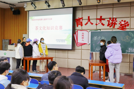 为传承和发扬我国优秀的茶文化,激发学生对茶文化的热爱之情,普及大家对于茶知识的了解,共同感受茶道文化带来的无限魅力。茶学院于11月22日晚在一教E101,举办了学生茶文化知识竞赛,茶学院院长郭桂义教授,辅导员梁玉洁、杜之正、朱尧,2021级学生观看了竞赛。大赛由茶文化与营销教研室、茶学教研室、茶学院团总支主办,茶学院学风建设部承办,瓦库茶馆赞助。