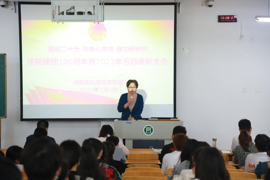 最后,学院党总支副书记朱建梅做总结讲话,她首先向受表彰的先进集体和个人表示祝贺,向为共青团工作付出辛苦劳动的老师和同学们表示感谢,她还讲到,时代造就青年,盛世成就青年,今年是迎接党的二十大胜利召开之年,也是中国共产主义青年团成立100周年,在“两个一百年”奋斗目标的历史交汇期,同学们既面临着建功立业的难得人生际遇,也面临着“天将降大任于斯人”的时代使命,希望同学们始终保持初生牛犊不怕虎、越是艰险越向前的刚健勇毅,在担当中历练,在尽责中成长,勇做奋进者、开拓者、奉献者。要始终保持学习的自觉性和紧迫感,努力掌握科学文化知识和专业技能,带头树牢和践行社会主义核心价值观,不断用优秀传统文化、革命文化、社会主义先进文化培根铸魂。要勇于投身实践、练就过硬本领,锻造会干事能成事干成事的硬脊梁、铁肩膀、真本事。
