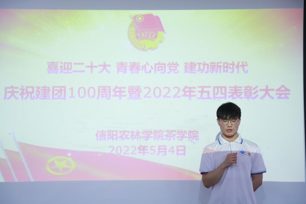 随后,荣获“茶苑之星”的学生代表柴蒙垚、李瑞升发言,他们结合分享了自己在学习、劳动、社会实践、志愿服务等方面的经历和成长,表达了自己对“五四”精神的理解和感悟,表示在今后将牢记习近平总书记对青年的嘱托,立志民族复兴,不负韶华,不负时代,不负人民,在青春的赛道上奋力奔跑,争取跑出当代青年的最好成绩。