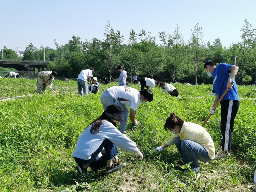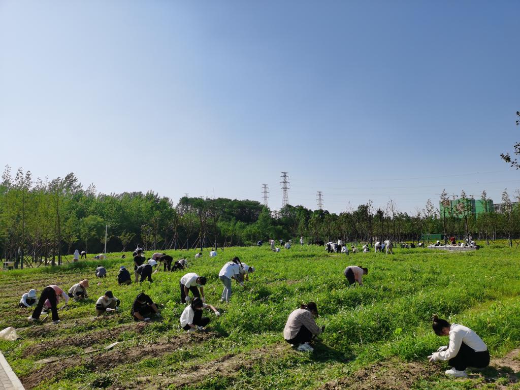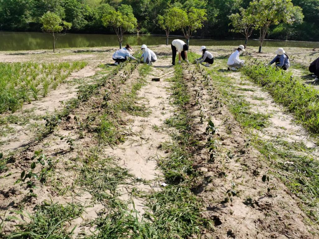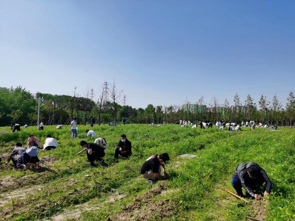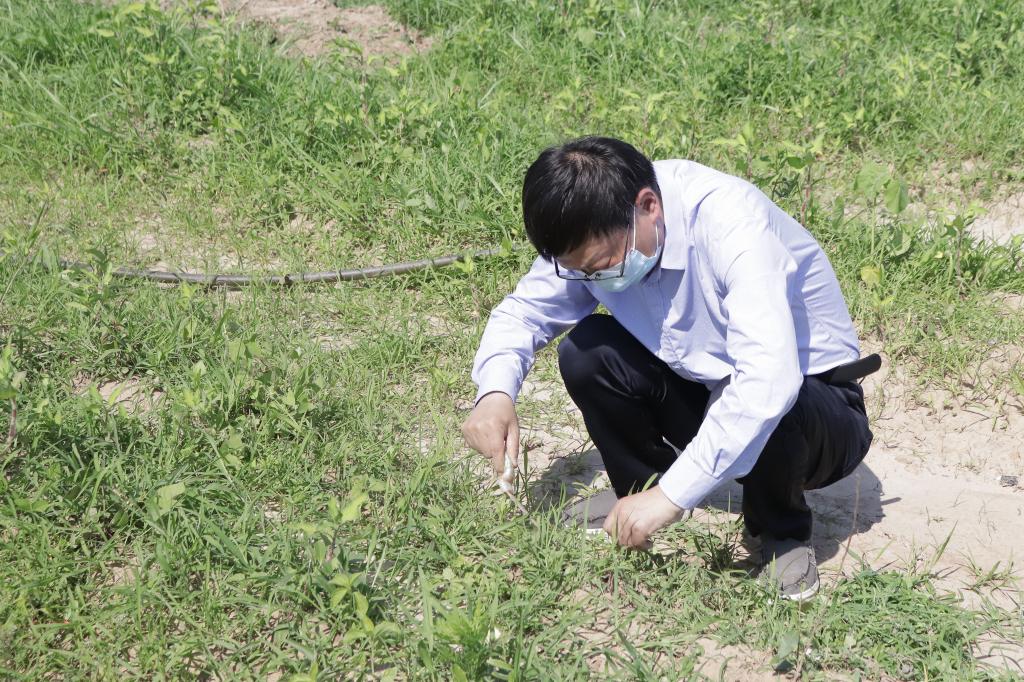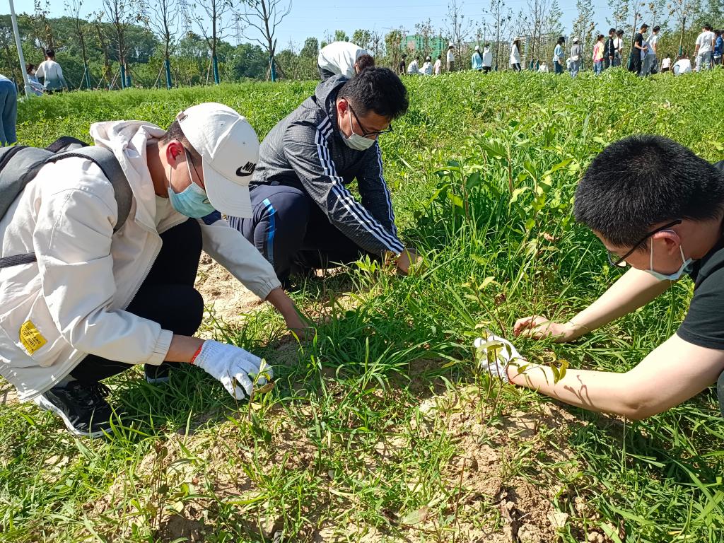 启动仪式结束后,郭桂义、孙慕芳、刘威、尹鹏、郭晓彦、孔亚帅、卫艺炜和陈凌芝等与同学们一起乘坐校车闭环接送学生抵达新农科(茶学)大学生校外实践教育基地(文新科技园)开展劳动活动,全程佩戴口罩。下午3时,骄阳似火,师生们在新建茶园按照分组井然有序地进行除草和根部覆土。他们或徒手或借助劳动工具(铲子、剪刀等)拔除茶园中的杂草,汗水虽湿透衣背,但仍抵挡不住师生们劳动的热情。经过3个多小时的辛勤耕作,新建茶园中的杂草一棵棵被师生们辛勤的双手拔除,一行行幼龄茶苗映入眼帘,师生们笑逐颜开。此次幼龄茶园锄草劳动为后期茶园铺盖防草布和茶树幼苗的茁壮成长奠定了良好的基础。