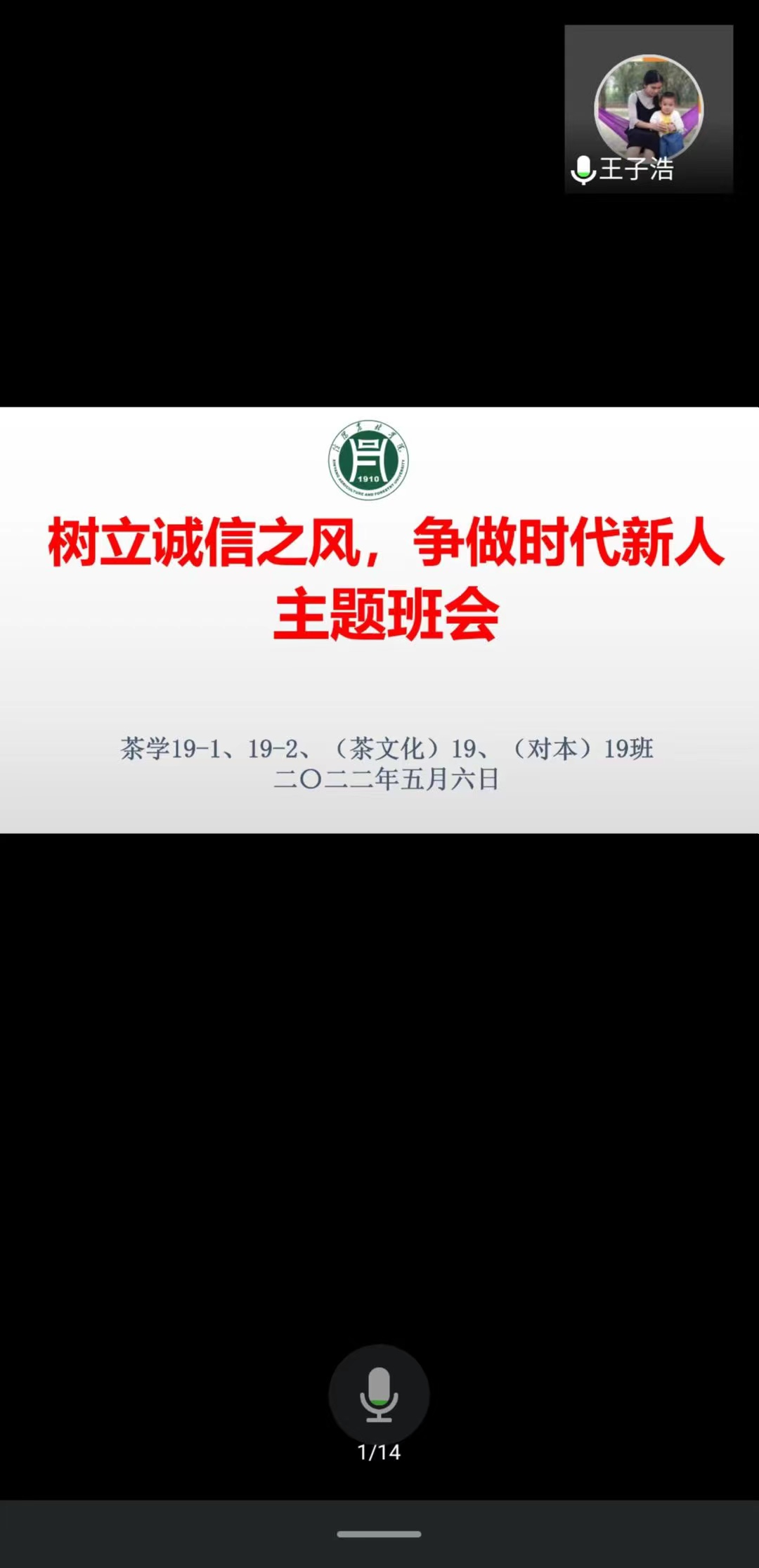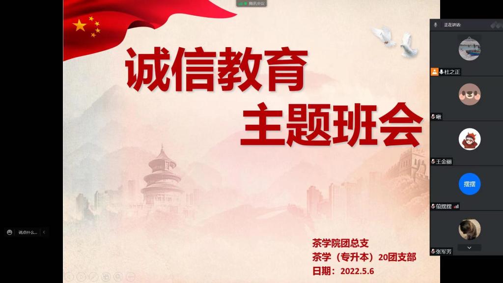 5月是beat365在线平台官网的诚信感恩月,为进一步巩固和深化beat365在线平台官网诚信教育成果,引导青年学生讲诚信、树诚信、践诚信,培养新时代大学生的诚信品质,强化诚信教育、励志教育、劳动教育和社会责任感教育,茶学院各班通过线上线下开展了“树立诚信之风 争做时代新人”为主题的班会。