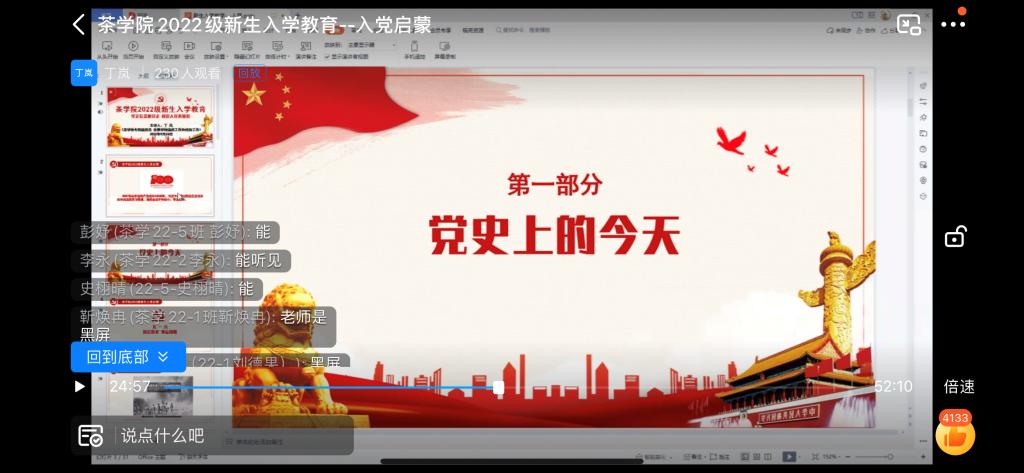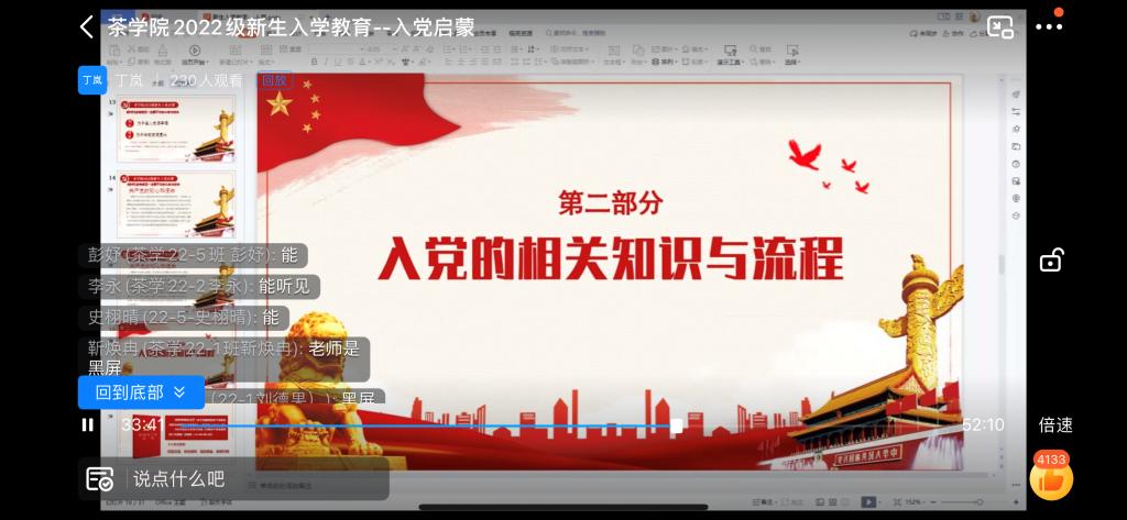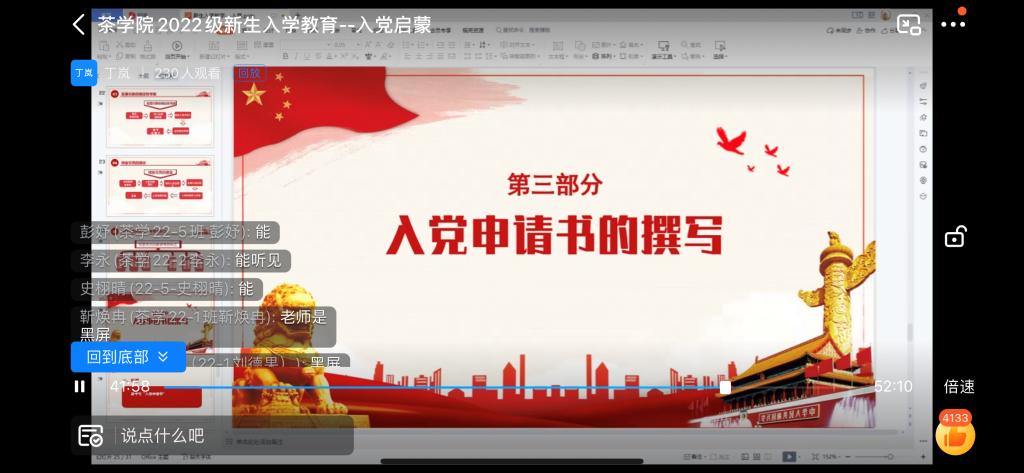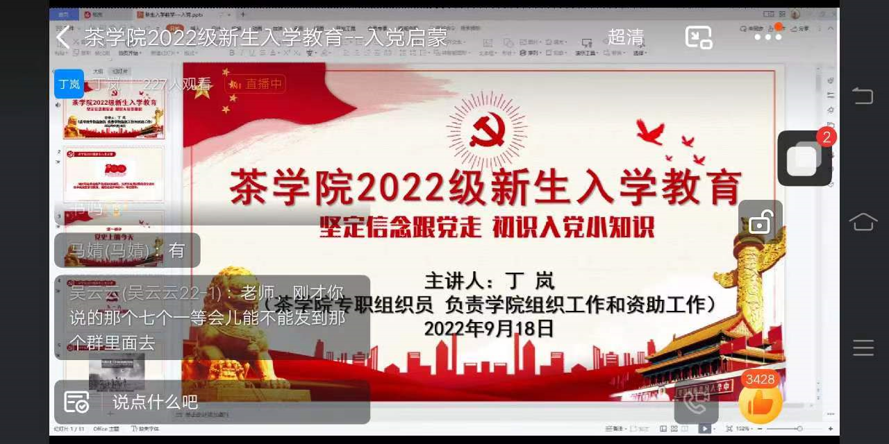 为深化2022级新生对党的认识,端正入党动机,进一步增强党性教育、爱国主义教育。9月18日上午,茶学院通过钉钉平台举行茶学院2022级新生入学教育---坚定信念跟党走,初识入党小知识,活动由茶学院专职组织员丁岚主持。