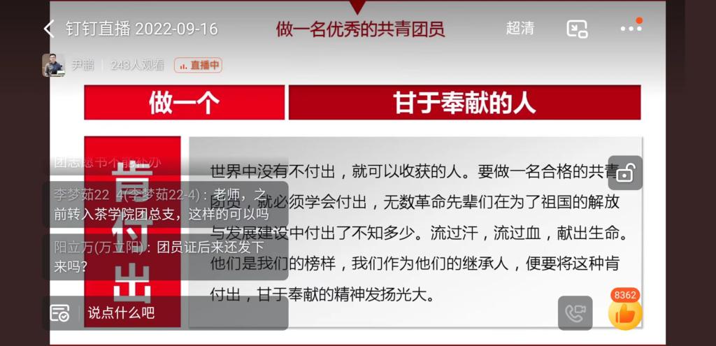 为进一步增强我院2022级新生对中国共青团的认识,引导广大青年学生团员树立远大理想,学习团的知识,做一名优秀团员,9月16日,茶学院在线上开展了2022级新生入学教育之做一名优秀团员,由院团总支书记王子浩主讲。
