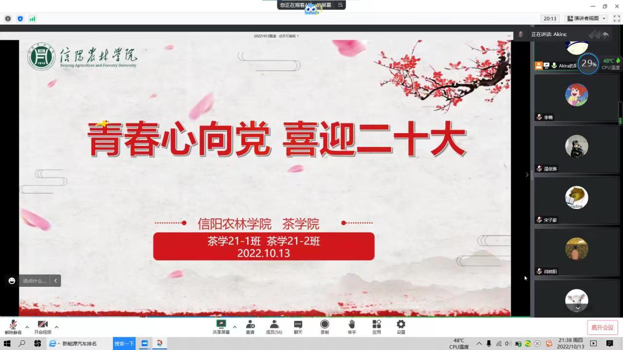 辅导员带领同学们回顾了中国共产党成立以来党和国家事业取得的历史性成就、发生的历史性变革,介绍了二十大召开的时间、程序和重要意义,同学们纷纷表示,将以实际行动践行青春心向党、建功新时代的决心,以优异的成绩迎接党的二十大胜利召开。