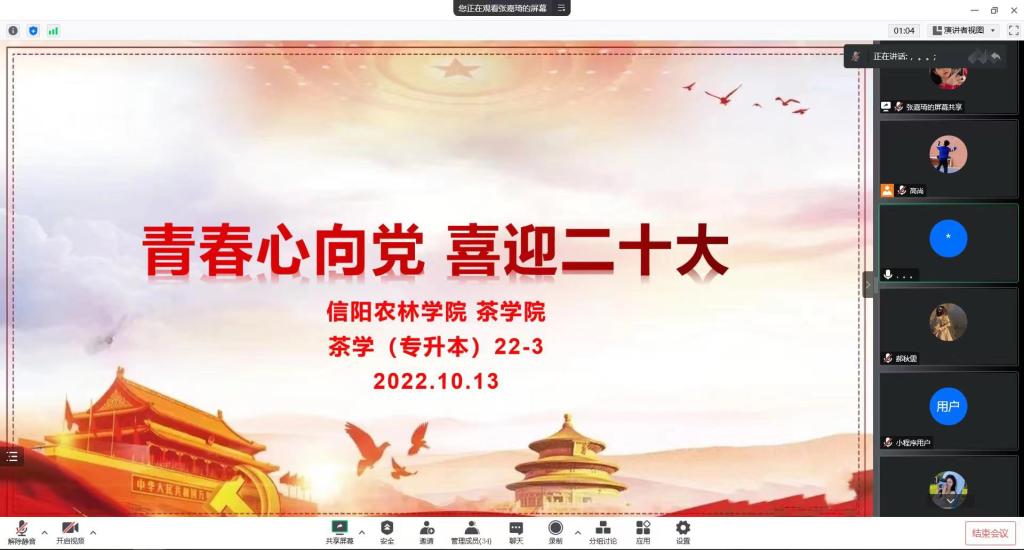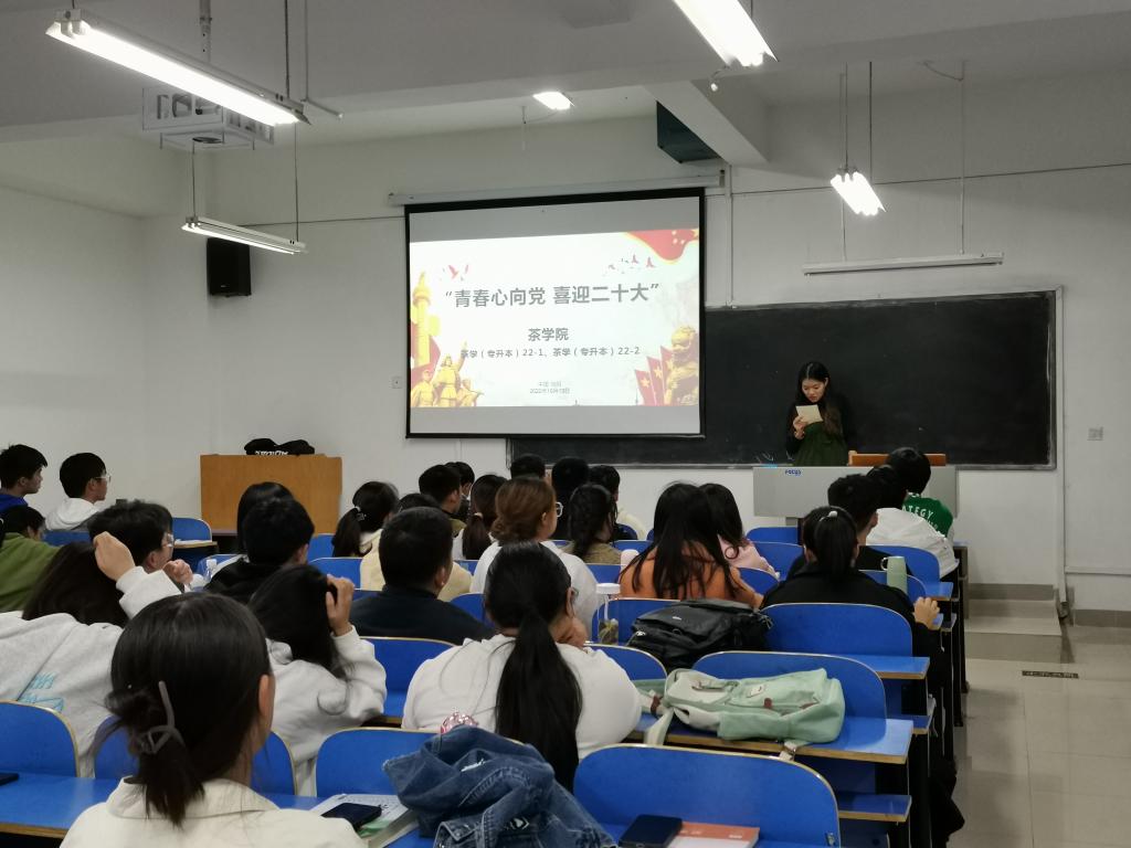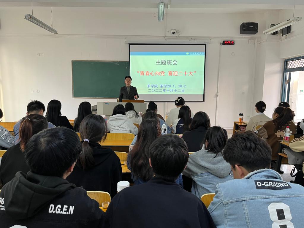 为迎接党的二十大胜利召开,团结引领学院学生永远跟党走、奋进新征程,传承红色基因,坚定理想信念,进一步增强全院学生爱党爱国爱社会主义情感,近日,茶学院各班召开“青春心向党,喜迎二十大”主题班会,班会由各班辅导员主持召开。