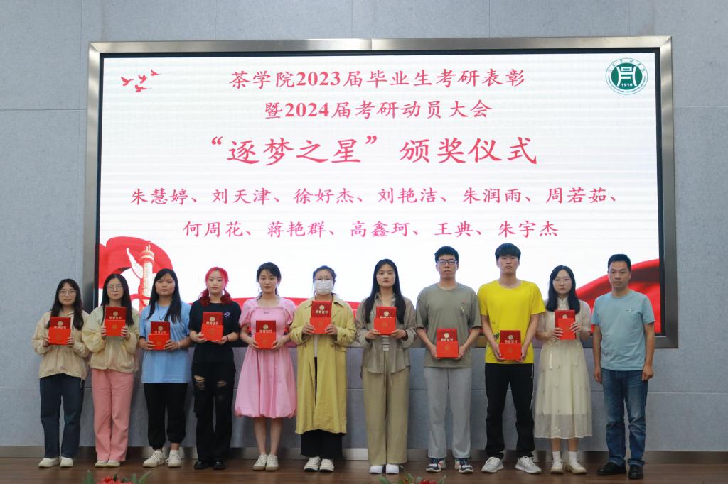 为表彰先进,树立典型,进一步培育良好学风,5月23日,茶学院在学术交流中心多功能报告厅召开了2023届考研表彰大会暨2024届考研动员大会。茶学院党总支书记、院长郭桂义教授、副院长陈义教授、党总支副书记朱建梅老师、团总支书记王子浩老师、组织员丁岚,2020级辅导员老师王杉、夏雨、朱尧和受表彰的2023届考研学生和2024届拟考研学生代表参加了大会。会议由党总支副书记朱建梅老师主持。