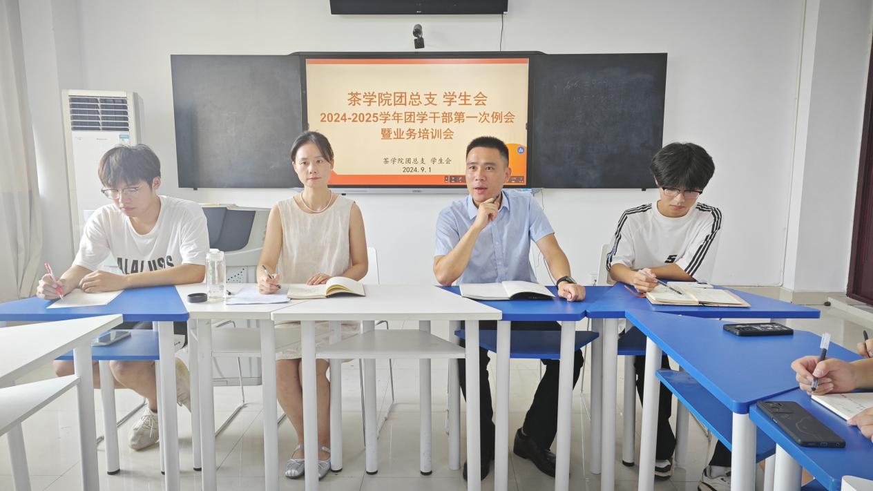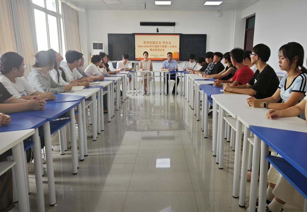 秋回校园,活力再现。新学期初启,为使我院学生干部收心聚力,在思想上警醒起来、在行动上振奋起来、在生活上自律起来,迅速从假期模式切换到学习与生活的正轨,进一步推动茶学院团学组织建设,增强团学干部的业务能力和综合素质,9月1日,茶学院在1C501召开了2024-2025学年团学干部第一次例会暨业务培训会。院党总支副书记王子浩、团总支副书记梁玉洁以及主要学生干部、社团负责人、22级、23级班长团支书参加了本次会议。