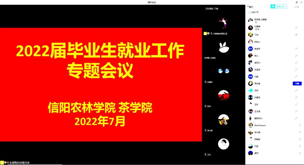 为切实做好我院2022年毕业生就业工作,7月19日茶学院于腾讯会议组织召开2022年毕业生就业工作专题会议。茶学院党总支书记、院长郭桂义、副院长孙慕芳、陈义和全体教师参加会议,会议由茶学院党总支副书记朱建梅主持。