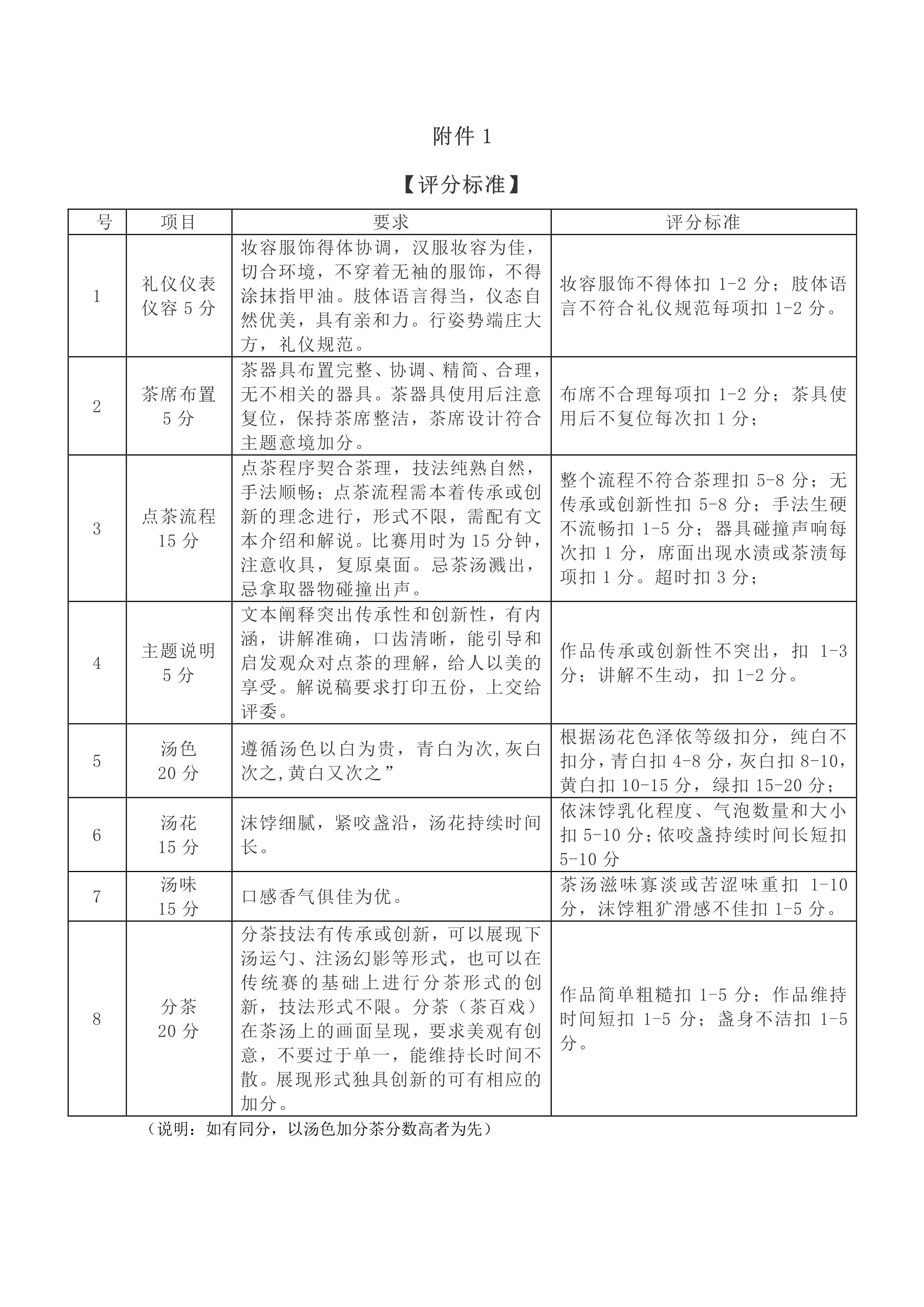 茶文化与营销教研室统一提供茗战桌椅、水、茶粉、茶盏、汤瓶、茶筅、茶匙等用具,选手自备汉服,茶服等服装。比赛时间为15分钟,备具、收具时间个3分钟。评分标准详见附件1。