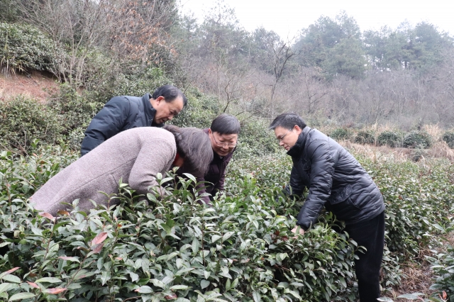 在保安寨茶场郭桂义教授一行观察了茶树的生长及冻害情况,与茶场负责人讨论了如何应对茶树冻害,并观察在冻害条件下发现抗寒性茶树单株,选育抗寒性强、适制信阳毛尖的茶树品种,与茶场负责人就茶叶生产制作进行交流,郭教授通过理论解释茶叶炒制和烘干过程中出现烟味的问题,提出改进方法促进茶叶品质提升,也建议茶场茶叶不要片面追求细条,兼顾外形与内质。