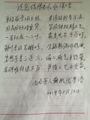 简介:黄执优,1929年生于广西贺州市壮族农家,中共党员,高级农艺师,中国茶叶学会会员,河南省优秀专家,国家有突出贡献专家,享受国务院政府特殊津贴、河南省第六、七、八届人大代表。曾任信阳地区行署茶叶专家组成员、信阳县农技站副站长、信阳县人大、政协数届常委委员,现是信阳市平桥区老年书画诗词研究会会员。