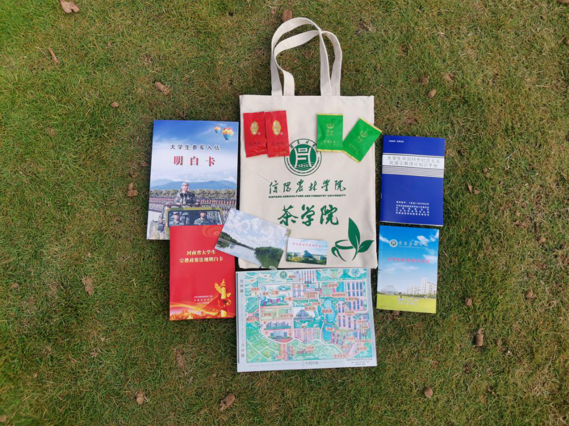 迎新大礼包内含学校卡通版地图、校园风景明信片、茶学院宣传册、大学生安全知识手册、大学生参军入伍明白卡、宗教政策法规明白卡等,以及信阳市车云茶叶有限公司赞助提供的4包信阳毛尖、信阳红茶茶包。这些资料可以帮助同学们熟悉校园环境、了解学校管理等。近年来,学院都会赠送同学们茶包,使同学们了解学院的特色,培养同学们对茶叶的喜爱,进而热爱这个专业。