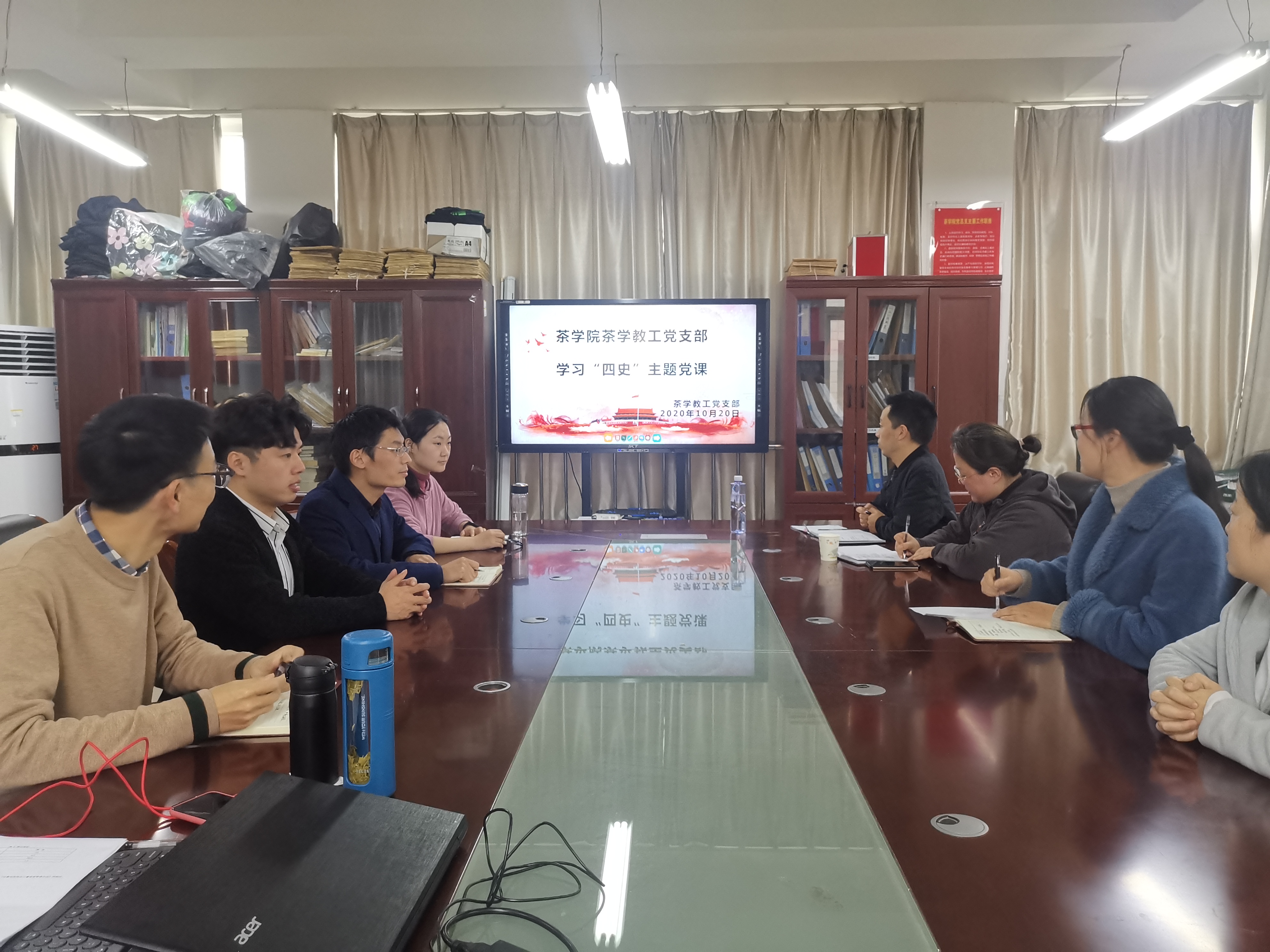 读史可以明智,知古方能鉴今。为深入学习贯彻习近平新时代中国特色社会主义思想和党的十九大精神,扎实推进党员学习教育的常态化和制度化,10月20日下午,茶学院茶学教工党支部书记黄双杰,在2C501为支部成员上了一起《薪火相传,使命勇担》的专题党课。茶学院副院长孙慕芳和陈义以普通党员身份参加本次党课学习活动。