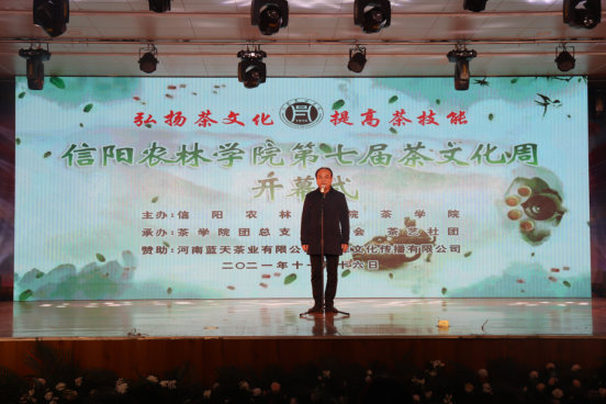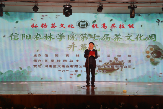 茶学院党总支书记、院长郭桂义致开幕辞。郭院长诚挚欢迎莅临指导的各位领导和观看开幕式的学校师生们,感谢茶学院师生们为开幕式的辛勤付出,他介绍了学院教学改革和成效、茶文化建设取得的成绩,最后预祝开幕式及茶文化周系列活动顺利举办。