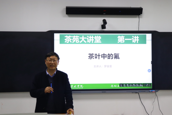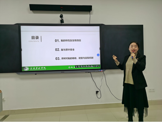 2021年11月25日晚,茶学院主办的“茶苑大讲堂”在科技楼1C501正式开讲,第一讲邀请茶学院罗金蕾博士做了题为《茶叶中的氟》的学术讲座,讲座也是学校第七届茶文化周的活动内容之一。讲座由茶学院院长、党总支书记郭桂义教授主持,副院长孙慕芳、党总支副书记朱建梅、部分青年教师和60多名同学参加了讲座。