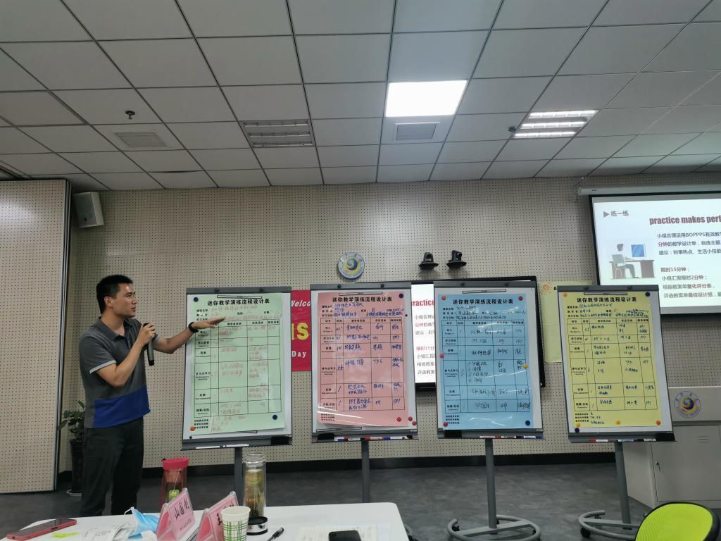 第一天为主题课程学习,由通过TDW、FDW国际认证的培训师介绍ISW的发展历程、微格教学演练设计方法及BOPPPS模块的具体内涵。参训教师在专家指导下,学习“以学生为中心”的教学设计理念和操作方法,引导教师从学习目标出发,设计实施课程内容、学习活动、评价方式。这改变了传统教学“只关注教师教的好坏、忽视学生学的效果”的缺陷,追求教学的效果、效率和效益,以做到真正的有效教学。后三天以微格教学演练为主,辅之互动教学技巧和评价方式学习,参训教师通过反复多轮教学设计、微格演练、同伴回馈和指导教师评价,熟练掌握有效教学结构。
