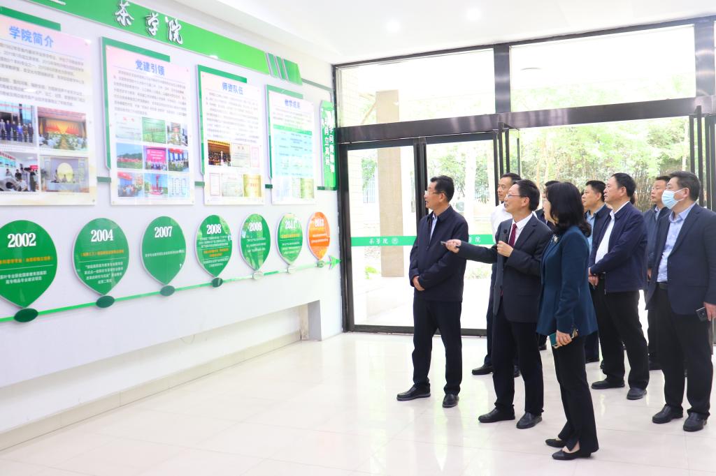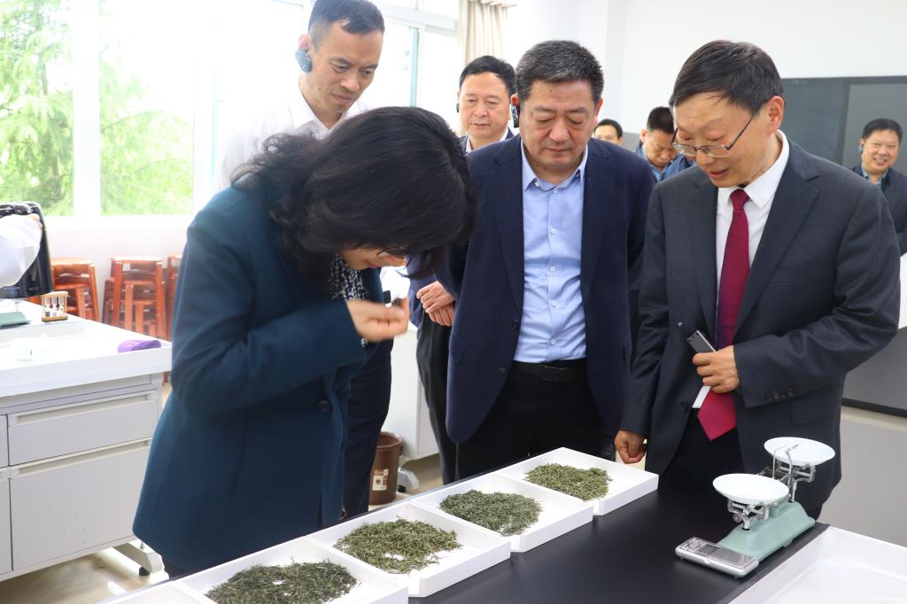 4月13日下午,省教育厅党组书记、厅长毛杰一行在信阳市委常委、副市长秦保建、beat365在线平台官网党委书记余作斌,党委副书记黄松,副校长赵聘、王万玲、刘开华等陪同下到beat365在线平台官网茶学院调研指导工作。在茶学院,郭桂义院长汇报了茶学院办学四十余年,在教学、科研、社会服务、文化传承等方面取得的成绩,专业核心课《茶叶审评与检验》被认定国家级一流本科课程、茶学专业为河南省一流本科专业、茶学教师团队被评为河南省高等学校黄大年式教师团队、主导制定了国家标准《地理标志产品 信阳毛尖茶》和行业标准《信阳红茶》等。