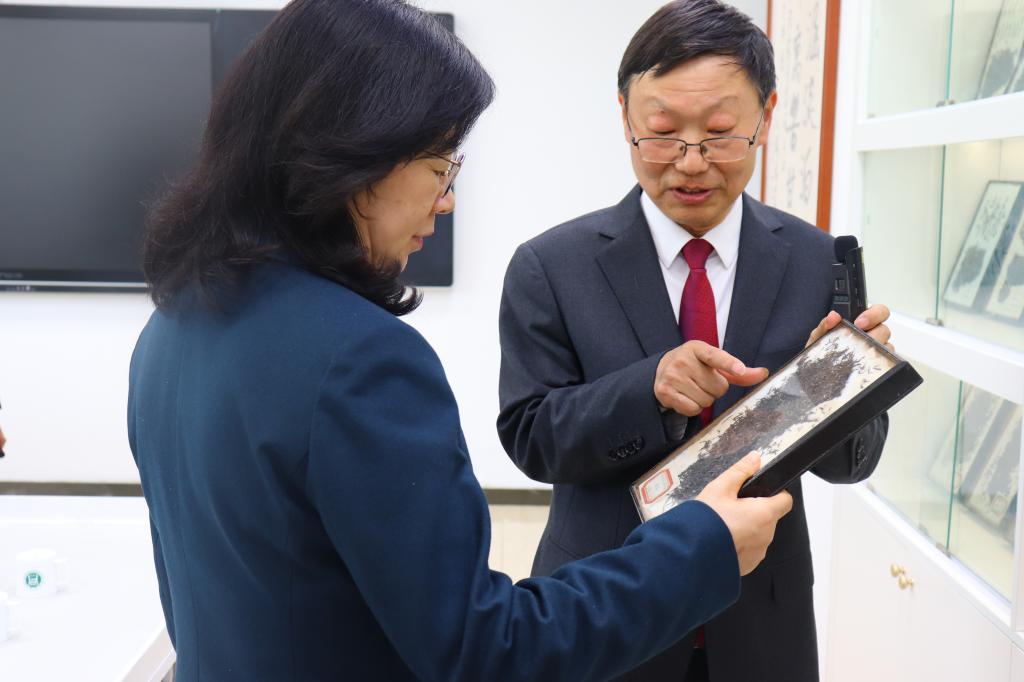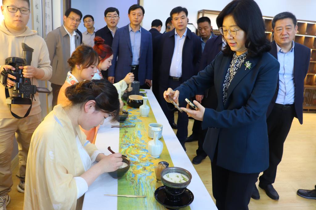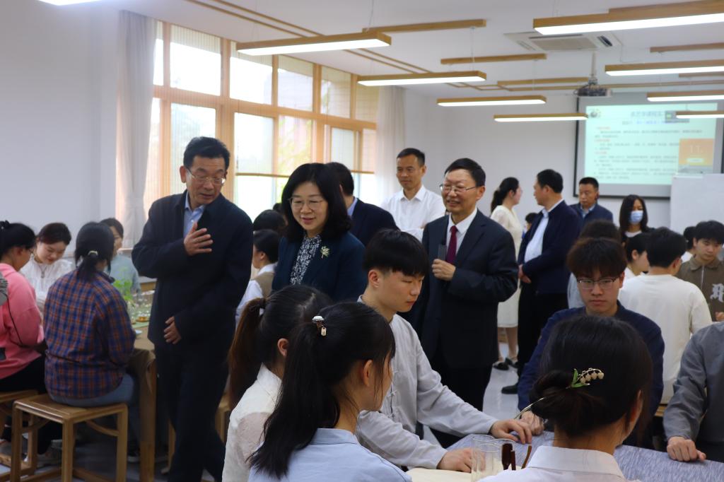 实地考察了河南省豫南茶树资源综合开发重点实验室的茶树生理生态与种质创新实验室和茶叶分析检测实验室,信阳毛尖茶加工实训室(信阳毛尖茶制作技艺信阳市非物质文化遗产社会传承基地)、六大茶类加工实训室、茶叶审评实验室(郭桂义国家级评茶员技能大师工作室)、茶艺实验室(茶艺信阳市非物质文化遗产社会传承基地)等教学科研场所。考察期间,毛杰与师生亲切交流,详细询问学生实训课程的宋代点茶和现代调饮茶的步骤流程,关注学生毕业课题探讨低温干燥和冷冻干燥对信阳毛尖茶品质的意义。郭桂义院长汇报,学生毕业课题结合国家重点研发计划子课题,通过科学方式寻求更优质的信阳毛尖茶;茶艺教学过程中重视复兴传统优秀文化、坚定提升民族文化自信的积极倡导,同时加强传统文化和现代文化有机结合。(撰稿人:王晶晶 审稿人:郭桂义)
