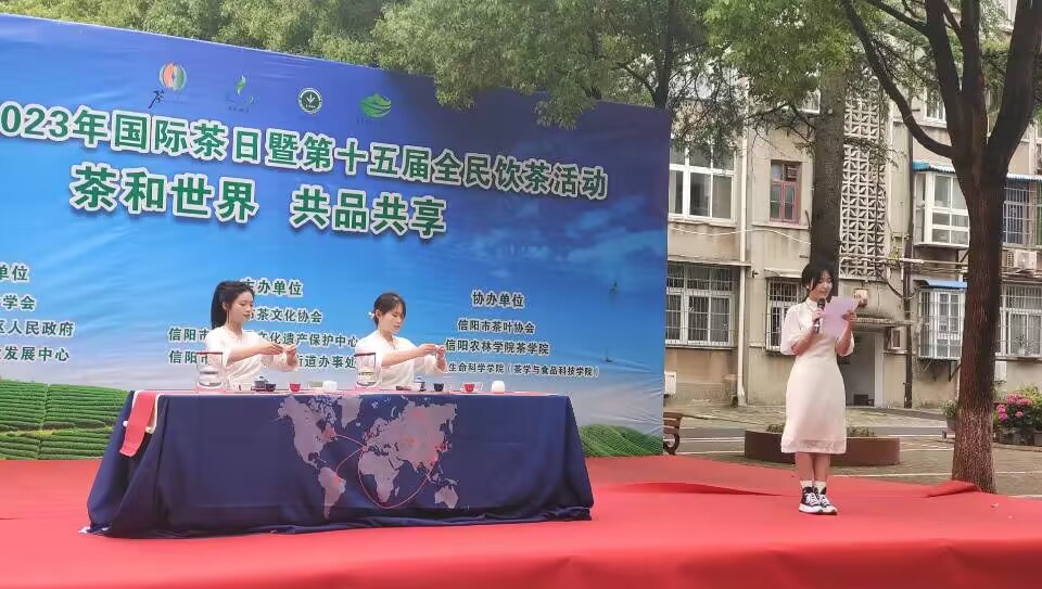 本次活动以“茶和世界共品共享”为主题,由中国茶叶学会、信阳市茶产业发展中心、浉河区人民政府指导,浉河区湖东街道办事处、信阳市茶文化协会、信阳市非物质文化遗产保护中心主办,信阳精彩文化传播中心、湖东办事处三五八社区承办,信阳市茶叶协会、beat365在线平台官网、信阳师范大学生命科学院(茶学与食品科技学院)协办的国际茶日庆祝活动在三五八社区隆重举办。