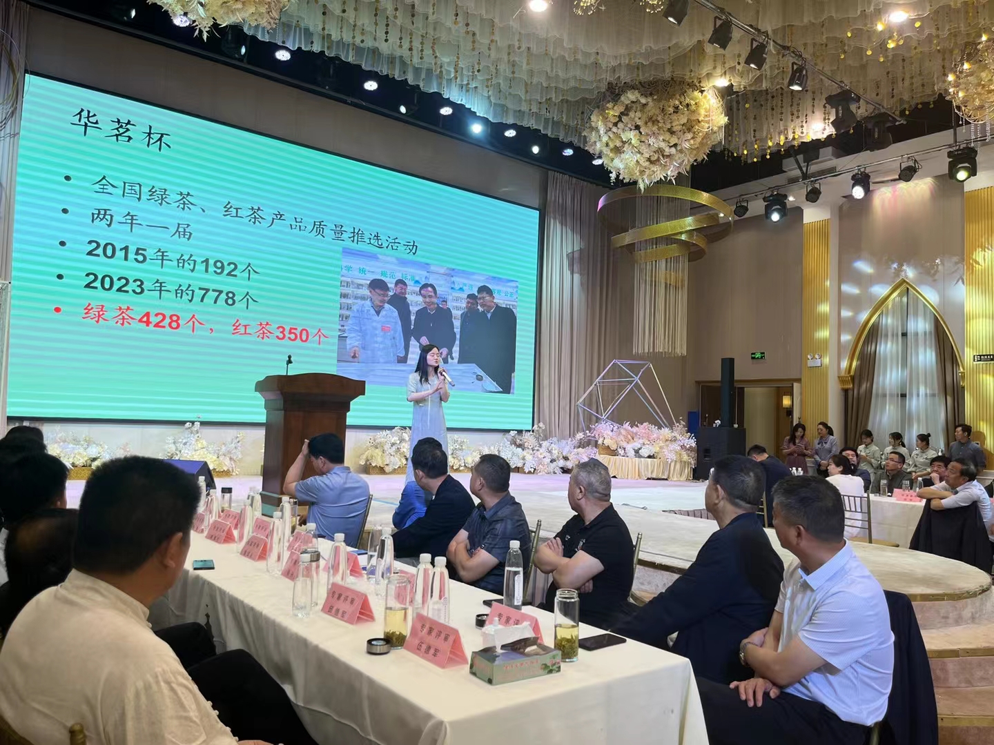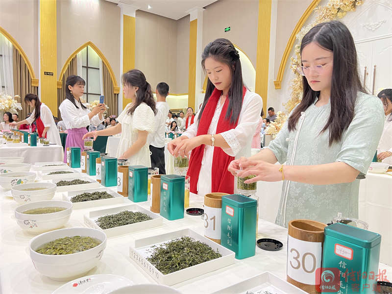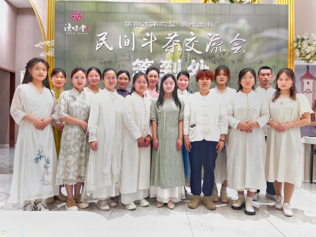 据悉,2023年5月29日,信阳市在知名餐饮企业“渔味堂”举行信阳市第三届“渔味堂杯”民间斗茶交流会。本次斗茶比赛由“渔味堂”主办,由beat365在线平台官网茶学院提供技术支持,由豫茶书院、顺和达包装单位协办。本次比赛设大众评委100人,专业评委12人,特邀嘉宾12人,其中专业评委和特邀评委由组委会推荐的信阳市各行业精英组成。我学院青年教师王杉老师为本次活动提供技术帮助,茶艺社团成员担任茶艺师,进行专业茶叶冲泡,一同助力比赛成功举办。