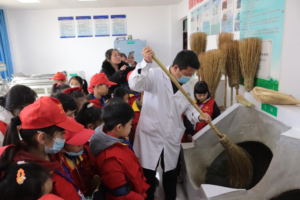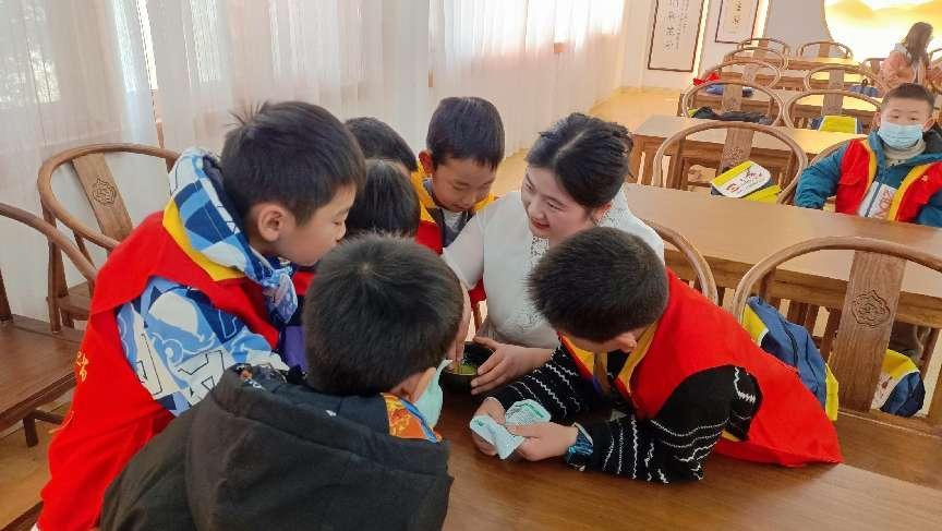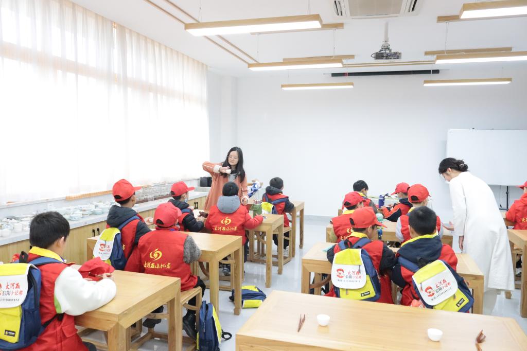 王子浩老师为小记者们全程讲解了信阳毛尖茶的历史、现状、炒制工艺和评审等知识并带领他们依次参观了茶学院1-2楼茶文化走廊、制茶实验室、茶叶审评实验室、茶文化实验室;在茶文化实验室和茶艺实训室,小记者们学习了由王杉老师讲解的茶具、泡茶技巧等知识,还亲自动手体验了宋代点茶;在信阳毛尖加工实训室,孔亚帅老师挥动茶把、展示信阳毛尖的炒制工艺,茶香四溢、引得小记者们连连赞叹。通过一看一闻一摸,信阳毛尖茶的外形、香味、色泽等都直观地进入到了他们的脑海中;在茶叶审评实验室,朱尧老师通过各式茶叶标本来帮助小记者们开阔视野,同时,实验室还特别准备了茶叶审评展示,使小记者们了解到看似相同的茶叶,冲泡后所呈现的香气、色泽、形状等也可能存在很大差别。