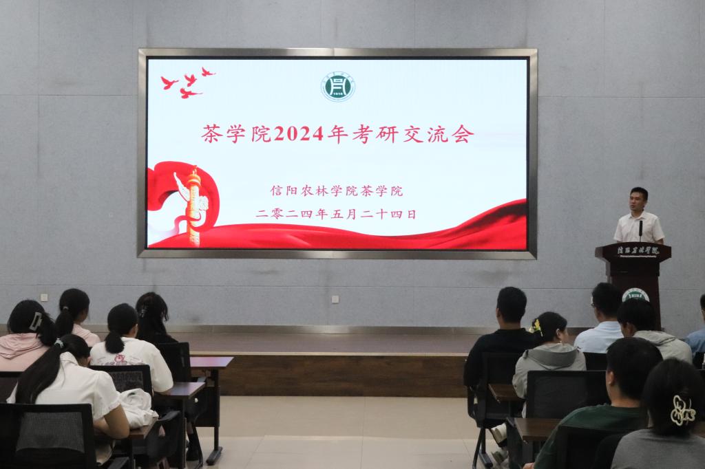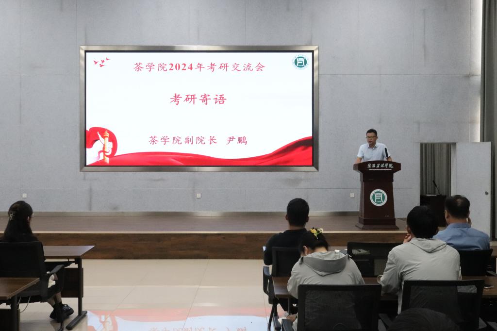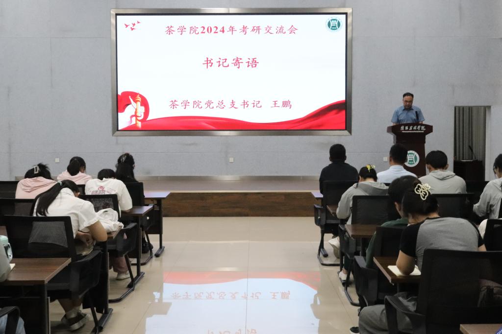 春风十里研途路,芳菲五月助研行。为落实立德树人根本任务,扎实推进“三全育人”走深走实,充分发挥优秀学子的引领示范作用,激励同学们向榜样学习,帮助同学们更好地了解考研形势,提高备考效率,5月24日中午,茶学院于学术交流中心1楼会议室开展了2024届考研经验分享会。茶学院党总支书记王鹏,副院长尹鹏,副书记王子浩,团总支书记梁玉洁,2021级辅导员王晶晶、孔亚帅,专任教师王利妍博士参加会议。活动邀请了10名考研学子分享经验,吸引了100余名同学踊跃参与。活动由党总支副书记王子浩老师主持。