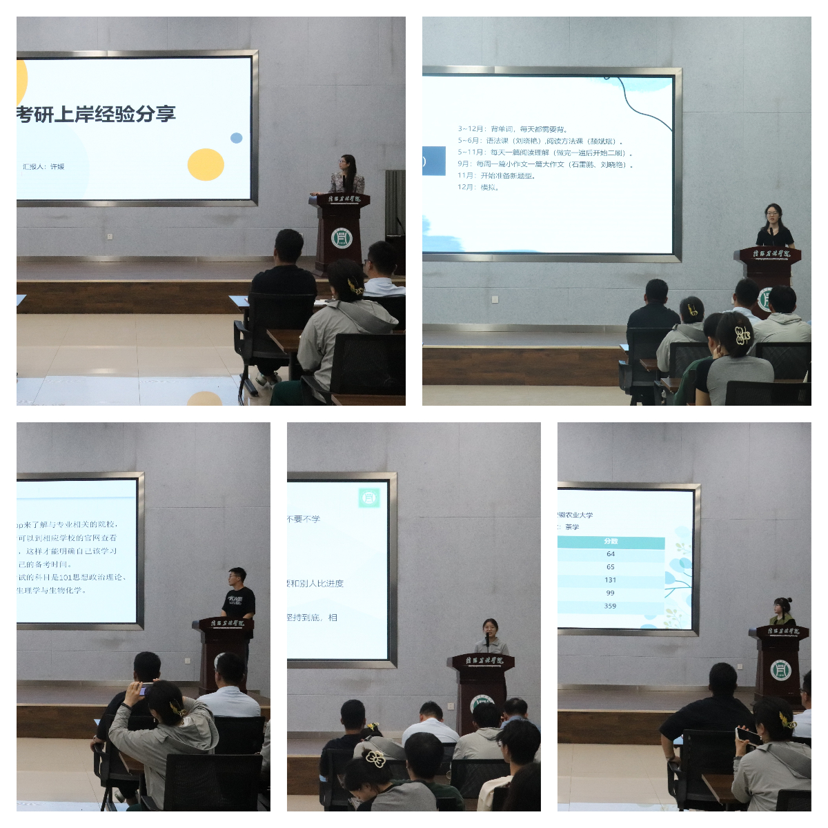 会议第二项,10名考研录取学子依次进行分享发言,他们分别从院校选取、复习计划的制定、复习材料的选择、心态调整、复试的注意事项、调剂准备、关注考研加分政策等方面分享自身备考的经验和感受。分享中,他们着重强调日常积累的重要性,并就如何备考提出几点建议,一是要明确考研目标,高效准确地获取考研信息;二是要养成独立思考的习惯,避免自烦扰和互干扰,制定合理计划;三是要注意劳逸结合,保持身心健康。