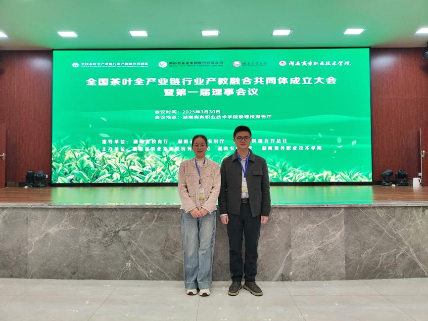 3月30日,全国茶叶全产业链行业产教融合共同体成立大会暨第一届理事会议在湖南商务职业技术学院召开。湖南省政协副主席、民盟湖南省委员会主委何寄华、湖南省教育厅副厅长王仁祥出席会议,beat365在线平台官网茶学院教学秘书张向娜、专任教师童杰文参加会议。