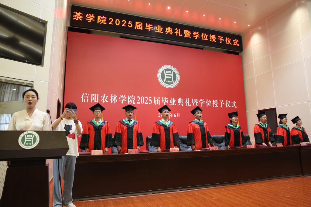 毕业生代表2025届茶学21-3班万亚欣讲述了自己大学四年在学院的学习生活,饮其流者怀其源,学有成时念吾师,也表明将秉持“为茶人、知茶性、懂茶心”的素养,脚踏实地,勇于担当,在各自的领域发光发热,创造价值。在校生代表茶学22-5班彭妤发表感言,她代表学院师生为毕业生们送上了最真挚的祝福。