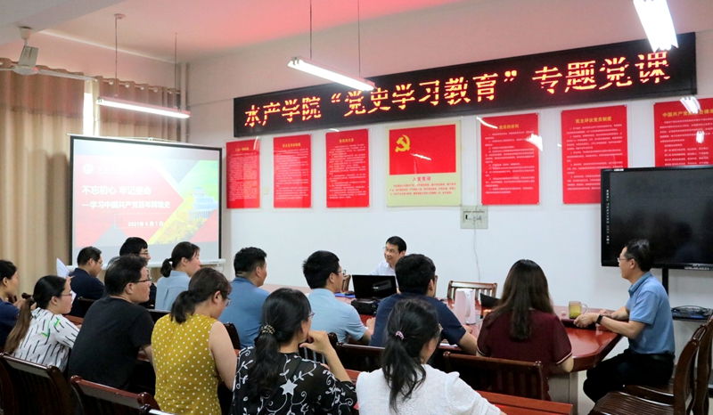 6月1日下午,副校长赵聘在水产学院2C330会议室以“不忘初心牢记使命——学习中国共产党百年辉煌史”为题,为水产学院师生党员讲授党史学习教育专题党课。党课由水产学院党总支书记郭旭升主持。