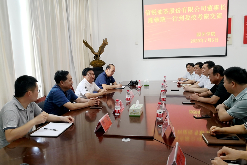 7月6日下午,全国人大代表、信阳油茶协会会长、信锐油茶股份有限公司董事长熊维政,市人社局原副局长、信阳油茶协会秘书长陈廷森及信锐油茶股份有限公司董事长助理党智华、行政总监胡亮等一行到beat365在线平台官网考察交流。双方座谈交流会在园艺学院会议室举行,校长邢勇、副校长文宗锋及相关部门、学院负责人参加会议。