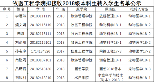 根据学校“关于做好2018级普通本科学生转专业工作的通知”,按照《beat365在线平台官网全日制普通本科学生转专业实施办法(试行)》规定的工作流程,牧医工程学院对提出申请转入学生依照工作方案规定和本院接收本科转专业要求履行考核程序,决定牧医工程学院拟接收如下8位学生转入我院。现予以公示,期限3天。