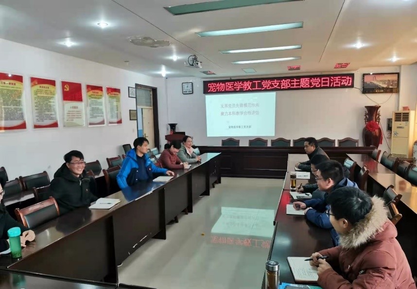 为确保本科教学工作合格评估评建工作的顺利开展,进一步增强党支部的凝聚力、战斗力和号召力,切实发挥党的基层组织的战斗堡垒作用,1月31日,宠物医学教工党支部在2C313开展 “发挥党员先锋模范作用,聚力本科教学合格评估”主题党日活动。会议由焦凤超主持,支部全体党员参加。