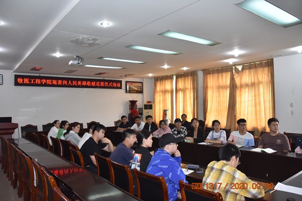 2020年9月30日是我国第七个烈士纪念日,中央电视台现场直播党和国家领导人同全国各界人士代表向人民英雄敬献花篮仪式。为进一步激发学生党员的爱国热情,缅怀革命先烈,弘扬烈士精神,牧医工程学院动物科学学生党支部、动物医学学生党支部组织全体学生党员收看了仪式实况。