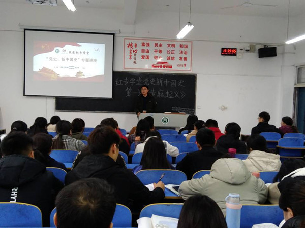 仪式结束后,由学生党员牛雪婷进行了“党史、新中国史”专题讲座第一讲——《黄麻起义》。牛雪婷同学通过讲述黄麻起义的背景、过程和意义,带领党员们重温了黄麻起义和鄂豫皖苏区革命斗争的光辉历史,并激励学生党员们要深入感悟革命情怀,忠心爱国爱党,牢记初心使命,永葆党的先进性,传承红色基因,为了理想信念而不懈奋斗。