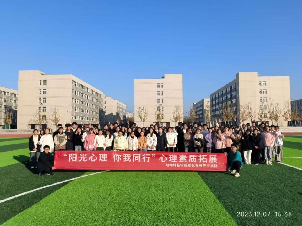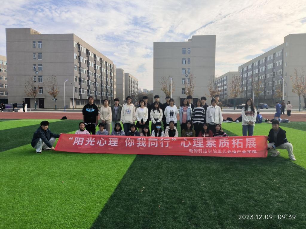 为加强动物科技学院2023级学生心理健康教育建设,让同学们放松身心,在团队合作中培养协作精神,培养学生“自尊自信、理性平和、积极向上”的素质品质,深化“三全育人”实效,2023年11月25日-12月10日,动物科技学院现代养殖产业学院在操场举办了“阳光心理 你我同行”心理素质拓展活动。