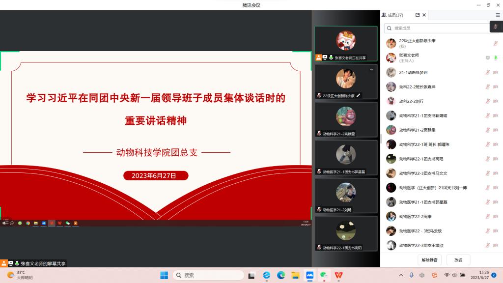 6月27日下午,动物科技学院团总支组织各年级团学干部召开线上学习会议,学院团总支书记张喜文老师带领大家深入学习习近平同团中央新一届领导班子成员集体谈话时的重要讲话精神,切实加强对广大青年的理想信念教育,推进主题教育走深走实。 习近平总书记强调:党和国家事业的希望寄托在青年身上。希望共青团中央深入贯彻党中央要求,切实肩负起新时代新征程党赋予的使命任务,传承弘扬优良传统,坚持改革创新,更好地把青年一代团结凝聚在党的周围,为推进强国建设、民族复兴伟业接续奋斗。