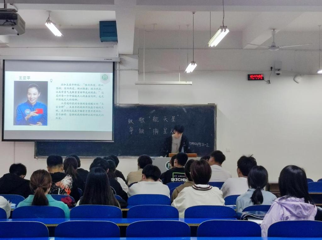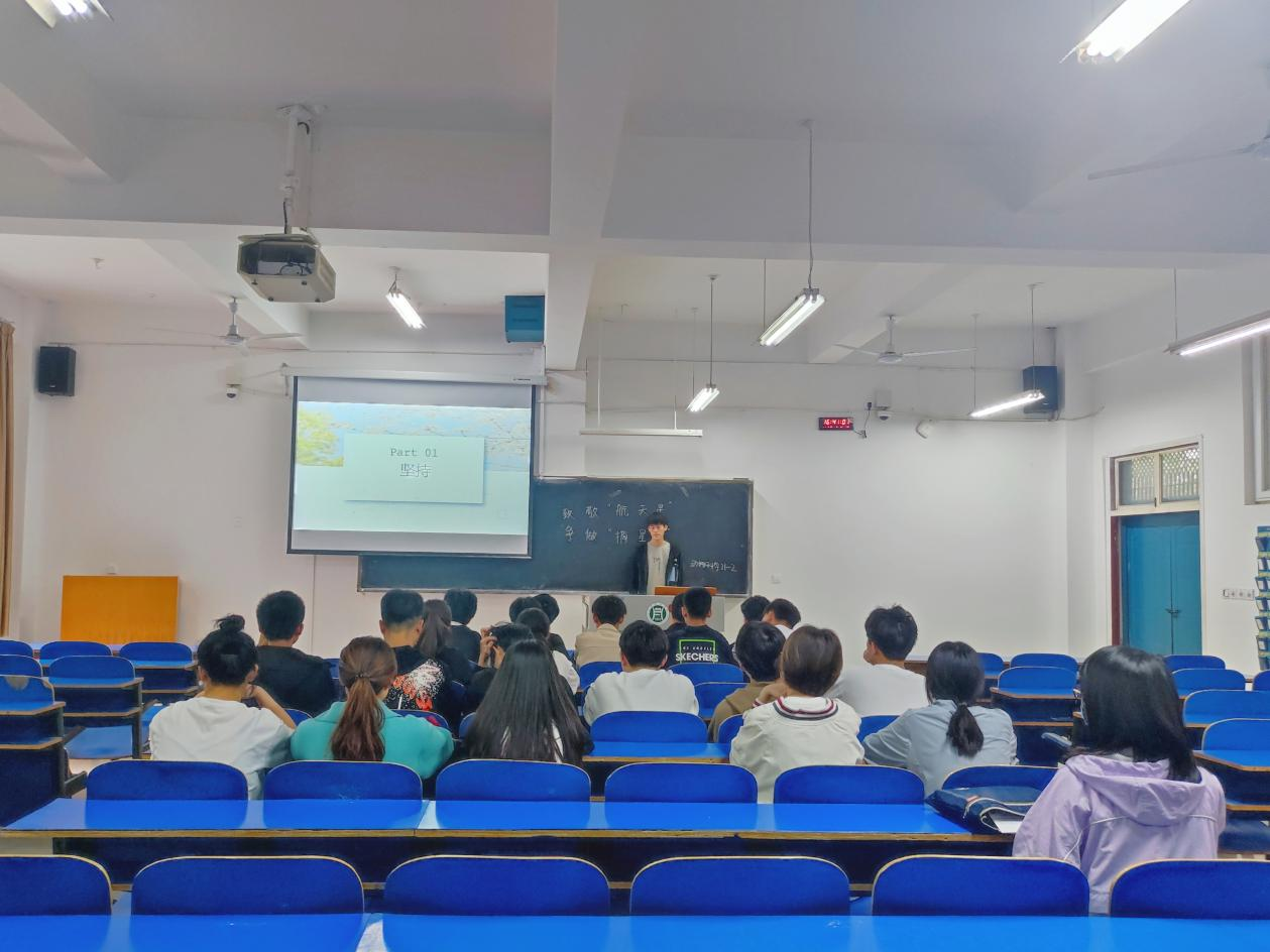 本次活动由王华北同学主持。首先以航天明星的英雄故事与同学们共享,再从伟大的航天英雄不平凡的事迹中总结出“坚持”、“热爱”、“担当”与同学们共勉,最后倡导同学们学习航天精神,为祖国的发展建设贡献青春力量!