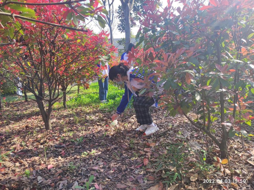 平时看似干净整洁的校园山坡,原来还暗藏着绿化时遗留的幼苗培植袋、营养液包装袋等白色垃圾。同学们拿着扫帚、垃圾斗、夹子,认真清理杂物。有的同学直接徒手搜刮垃圾,不怕脏,不叫累,不放过任何一个角落。整个活动井然有序,每个人都在尽自己的微薄之力,使山坡上的植被茁壮成长,校园山坡的景象焕然一新!