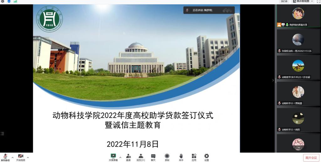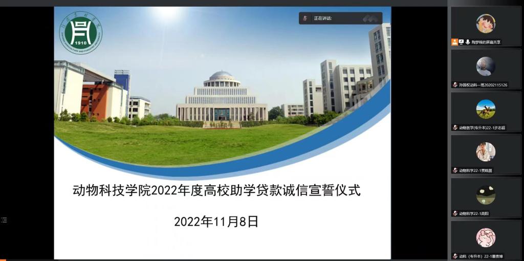 2022年11月8日,动物科技学院举行线上高校助学贷款合同签订仪式暨诚信主题教育和高校助学贷款诚信宣誓仪式,学院资助专员陶梦筱老师主持本次会议。